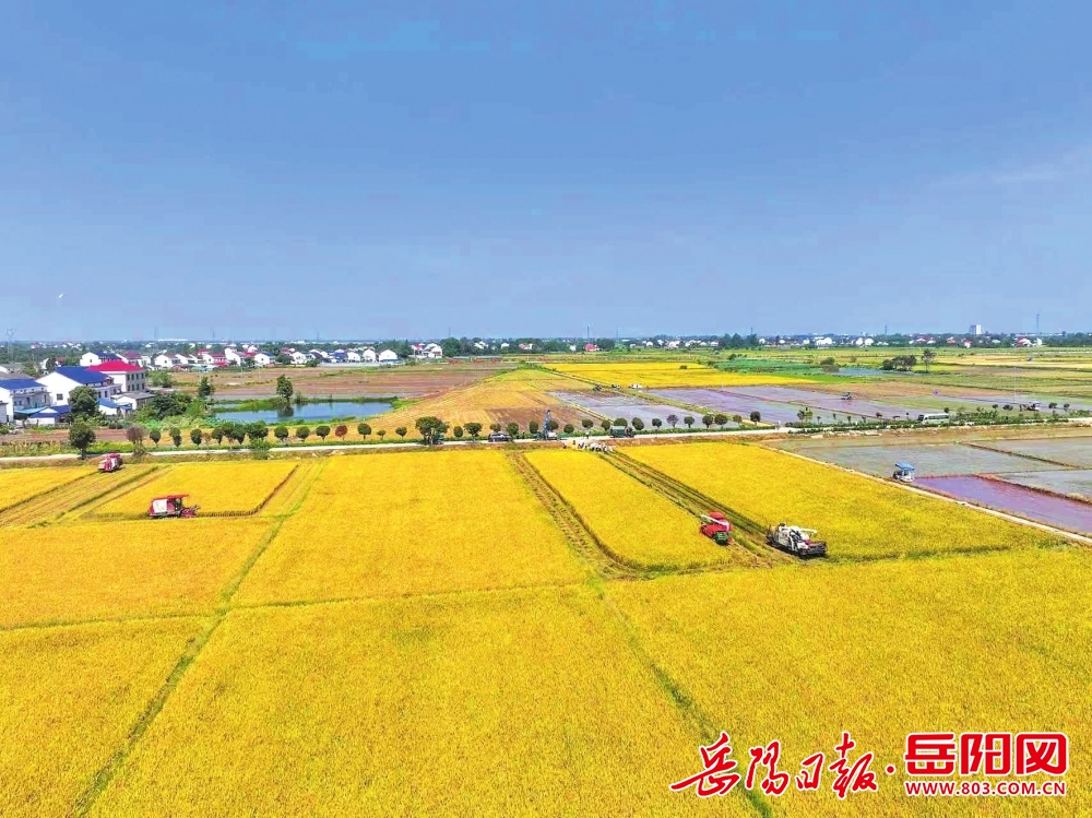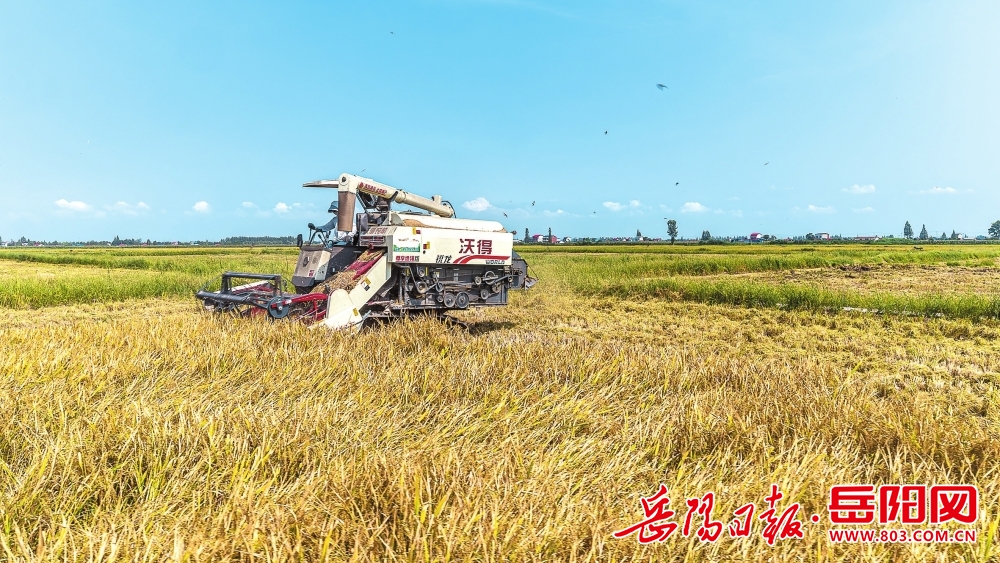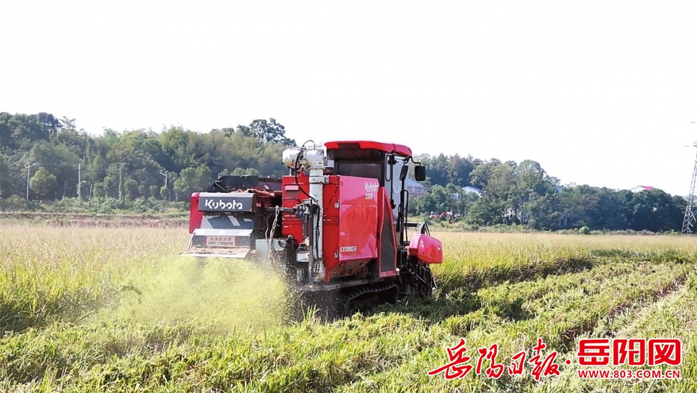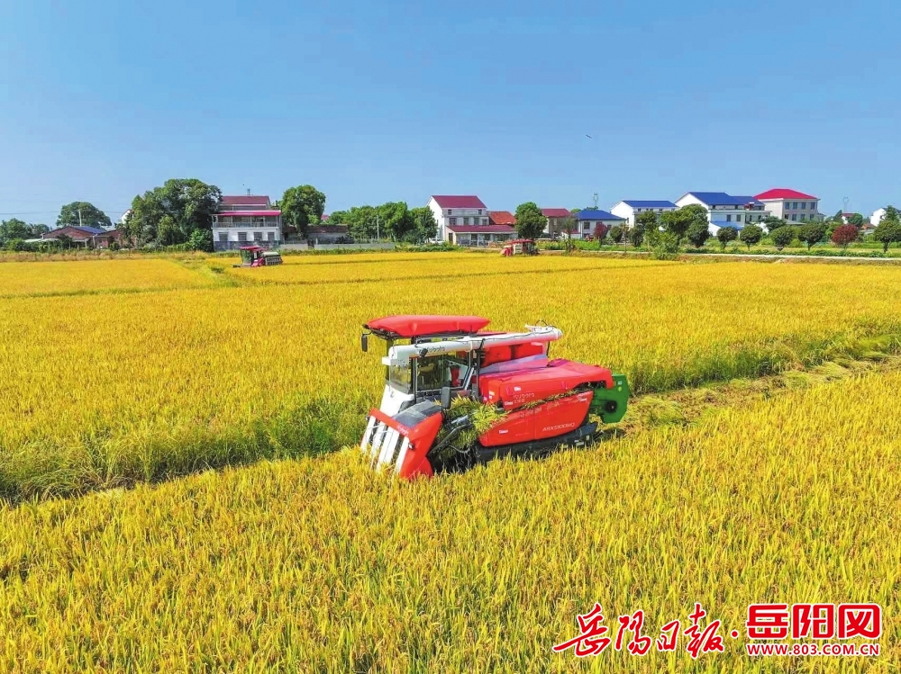 云溪區,收割機械在金黃色的稻浪中穩健前行。