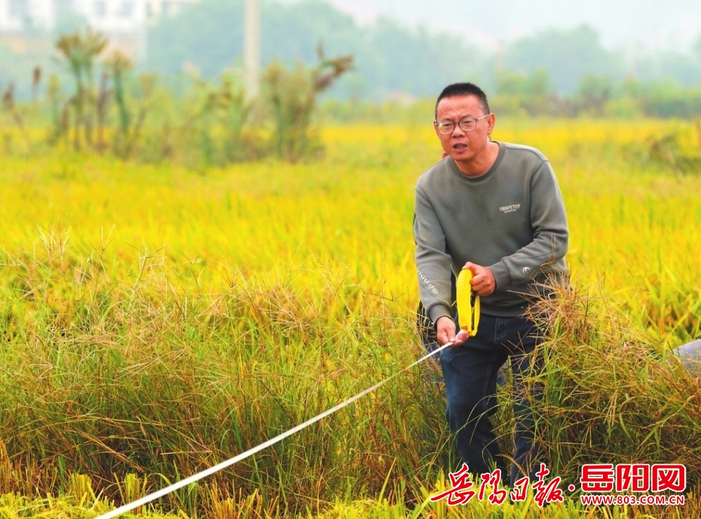 岳陽縣筻口鎮潼溪村,測產科研人員測量試驗田面積,為豐收提供數據支撐。岳陽日報全媒體記者彭正陽攝