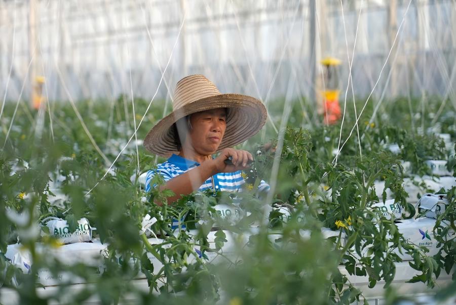 在江西省贛州市于都縣梓山鎮潭頭村的果蔬種植基地,村民給絲瓜整枝(2025年1月3日攝)。新華社發(劉小強 攝)