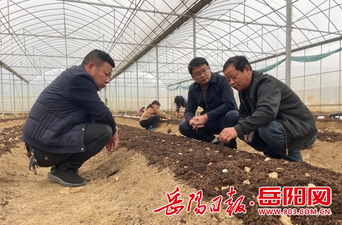 地頭一側大棚內,一排排栽培菌菇的畦床整齊排列。湖南省蔬菜產業技術體系食用菌岳陽試驗站的技術人員周威正在現場指導:“蓋草務必均勻,厚度控制在5厘米左右,這樣才能有效保溫保濕,為菌絲生長創造理想環境。”他特別叮囑公司負責人熊岳飛,當前正值菌絲萌發的關鍵階段,必須精準控制濕度、及時清理排水溝,嚴防積水影響菌絲發育。