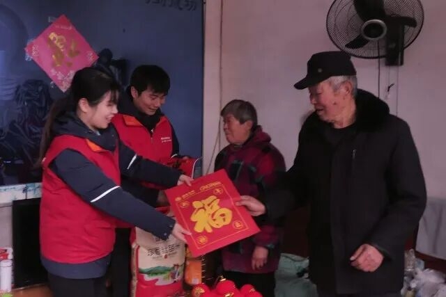 巡檢結束,隊員分頭前往留守老人家,送上大米、食用油,貼上春聯。